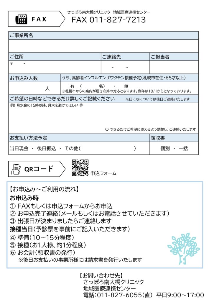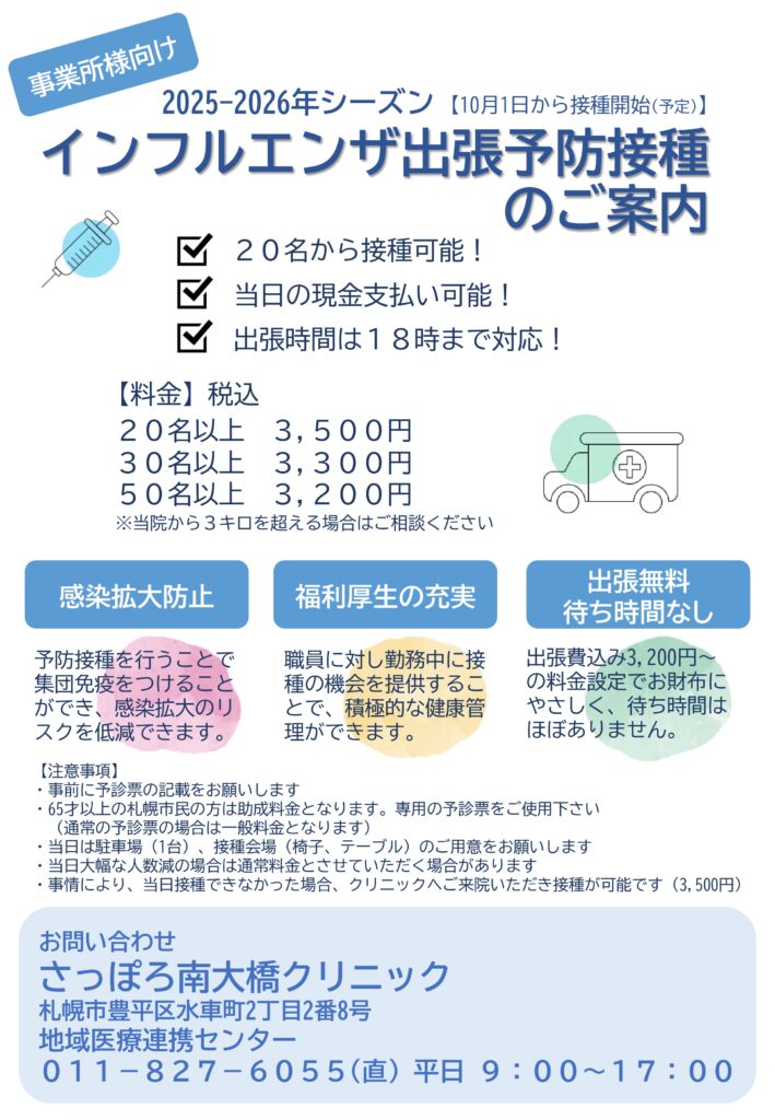 当院では、地域の事業所様向けにインフルエンザ予防接種の出張サービスを承っております。ご希望の際は、接種予定人数(20名様以上)や実施場所(当院から3キロ以上の場合はご相談)などの条件を確認させていただいた上で、出張での対応が可能かどうかをご案内いたします。